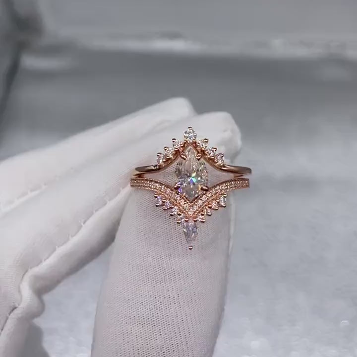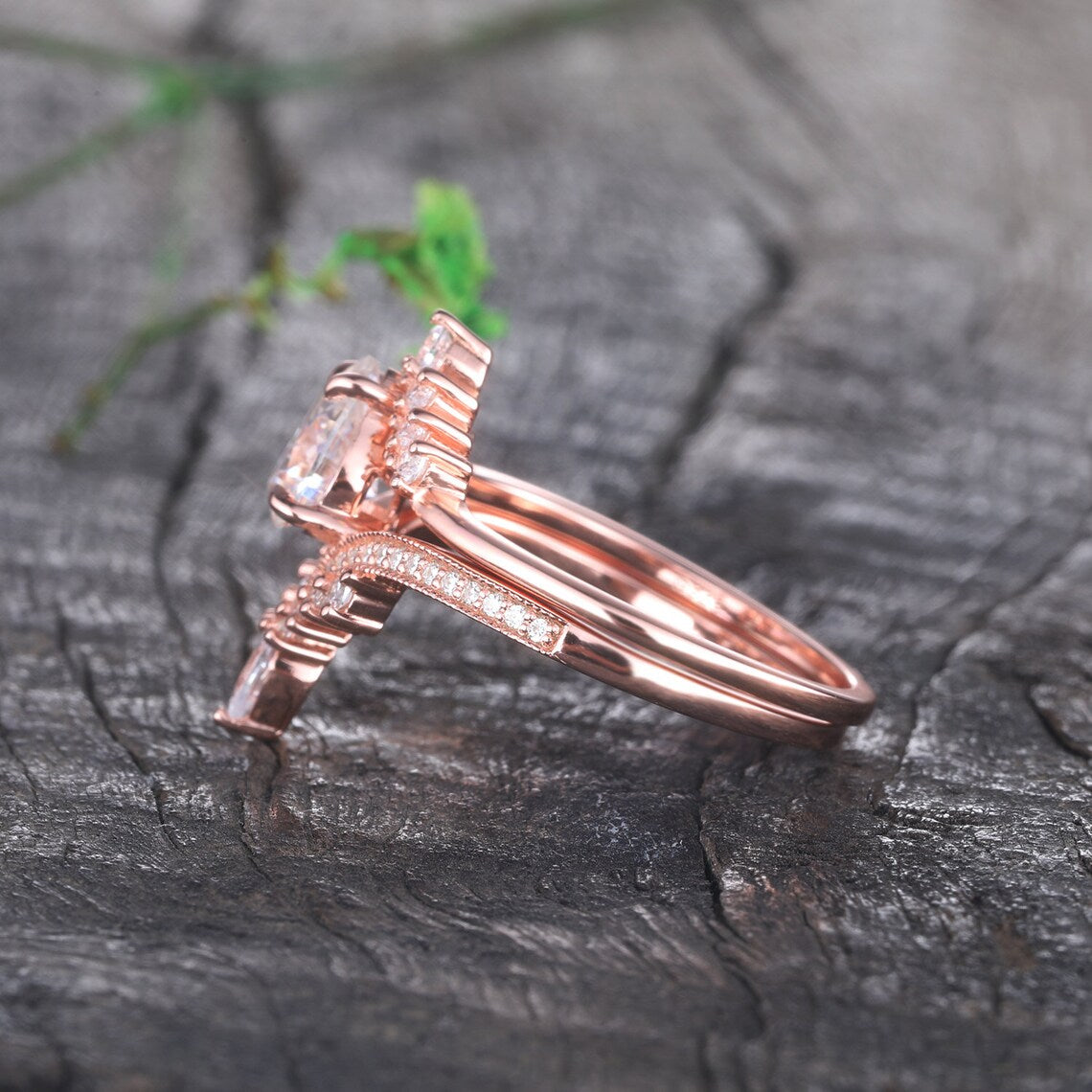 Vintage Moissanite Engagement Ring Set Rose Gold Pear Moissanite Bridal Set Curved Wedding Band Promise Anniversary Ring Antique